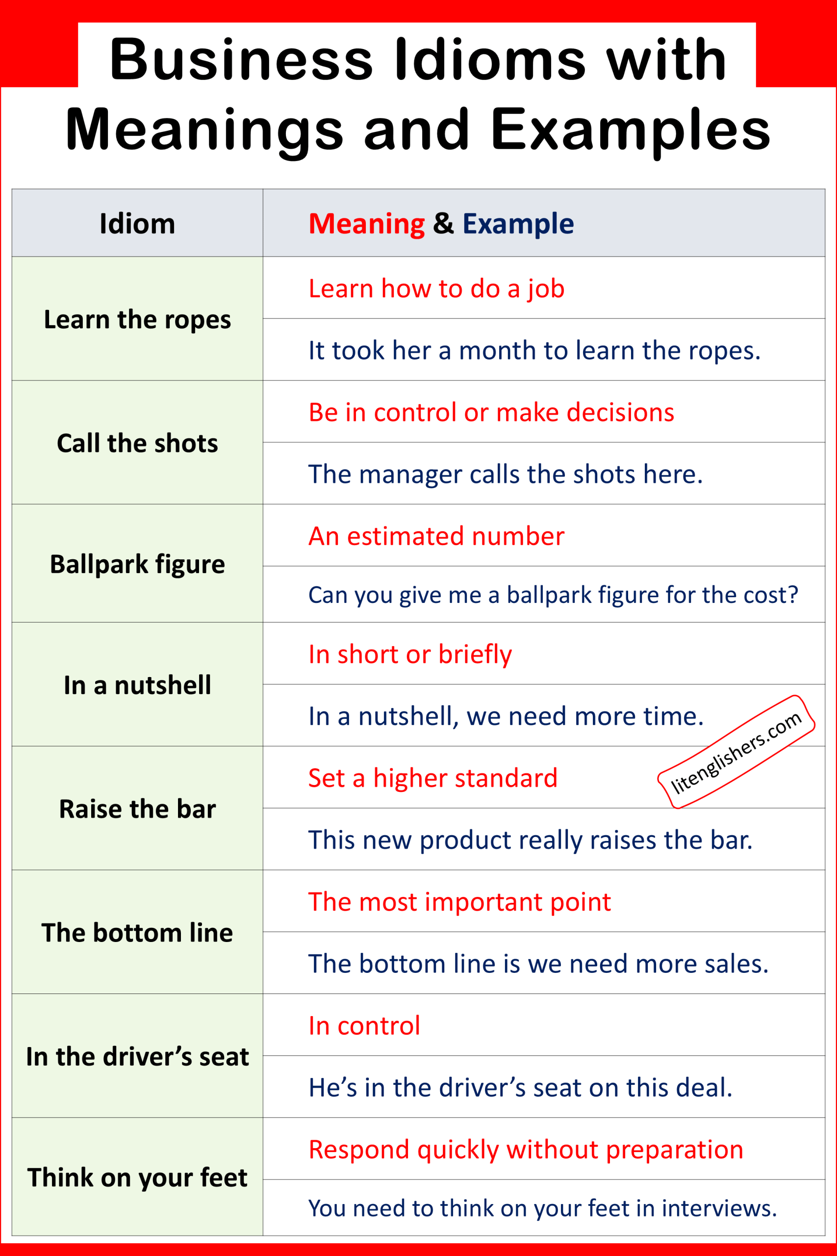 Business idioms are special phrases that do not mean exactly what the words say. They are often used in the office or in work-related situations. Learning these idioms helps you sound more natural and professional in English.