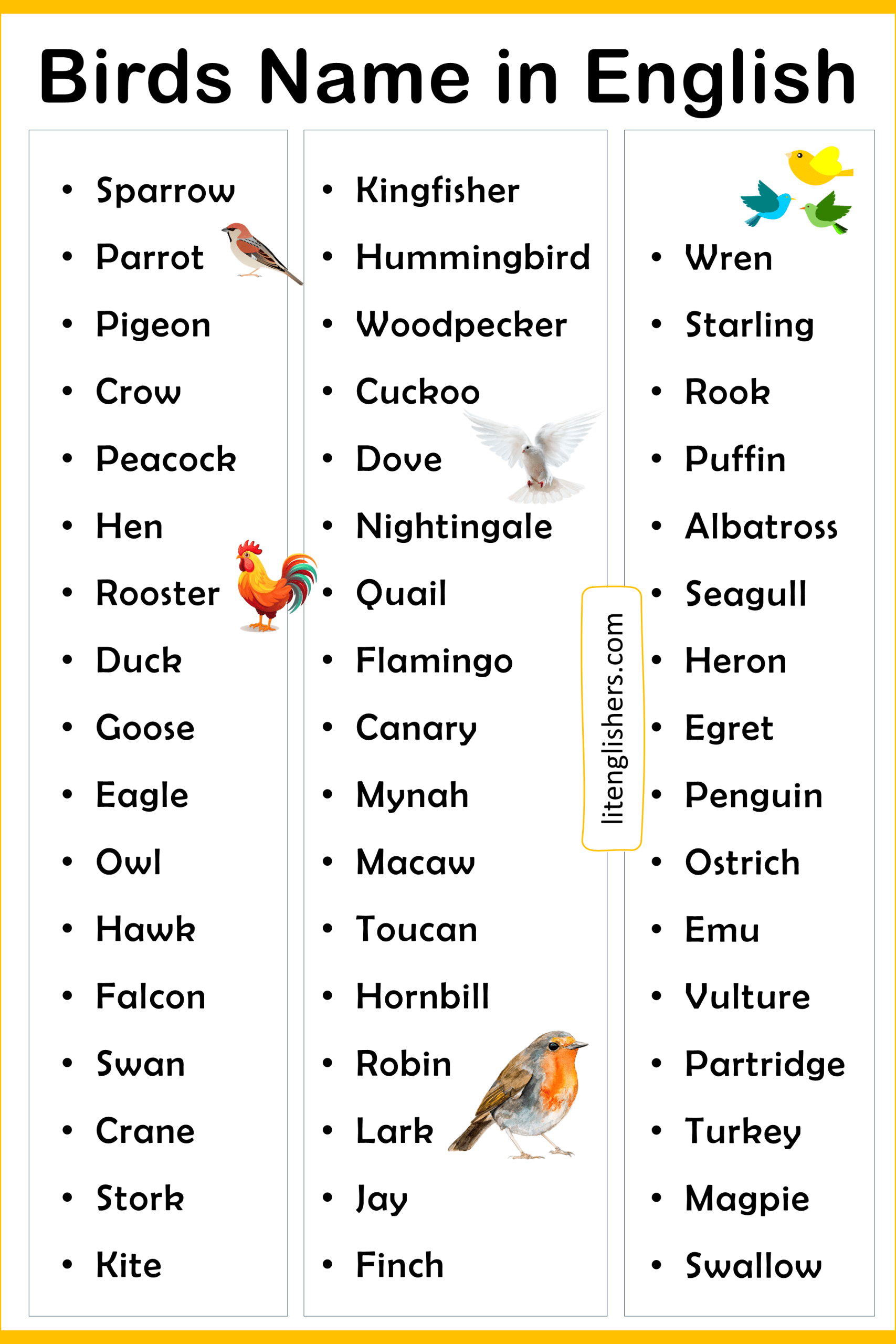 Learning bird names improves your nature vocabulary and helps you speak better English. Use this list often and try to speak or write sentences using these names. You can also learn more animal or bird names with pictures to improve faster.